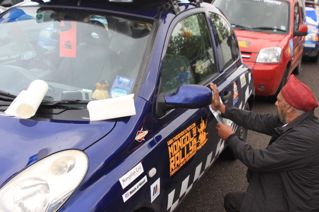 DAY0 14 Published May 19, 2015 at 1024 × 682 in Mongol Rally 2012 – Day 1 – It Begins My Dad putting on some Decals
