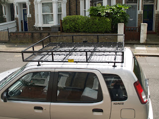 | A normal roof rack | What I mean by this, is that you have roof rack bars and put an open roof rack on it. We did this on ours, it was a £90 lightweight aluminium rack from eBay. we added lightweight MDF to the tray for better support, and it wa perfectly adequate. However, we found we needed a heavy duty tarp to cover the contents so they didn't get wet and this was a massive phaff as we would have to undo the tarp first to get at anything. By the end of the rally, we were an efficient machine at getting in and out of the tarp, but I would say that our morning getting the roof rack ready took roughly 10-15 minutes. This is a big deal if those in your convoy can get ready in half that time, nobody likes hanging about for the retard team. - Pros are price and low weight, cons are you can't sit on them, most have a max limit of 60kg |